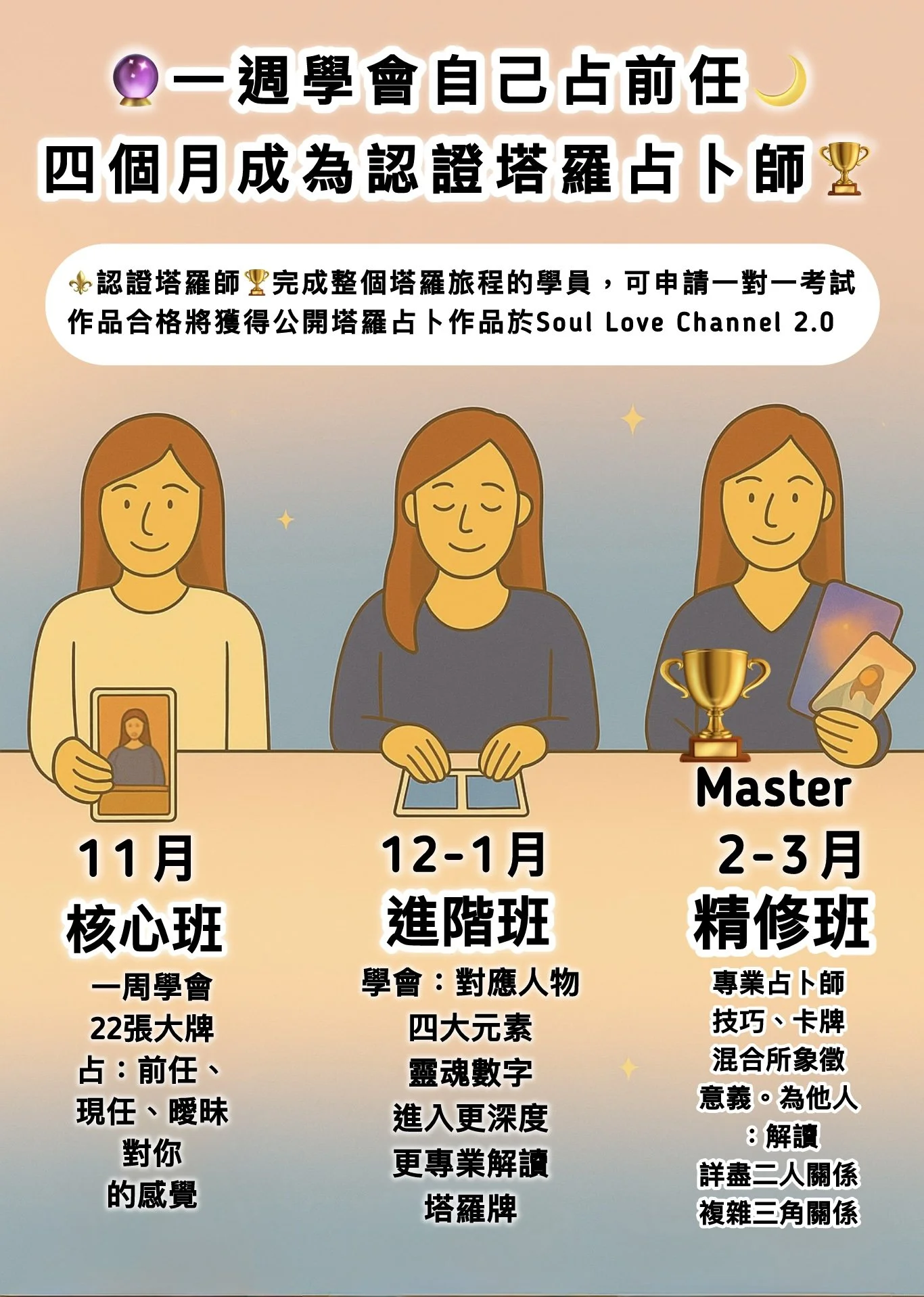 🌈讓你能為自己占卜🌟 塔羅22大秘儀基礎班|SOUL LOVE CHANNEL® 愛情占卜導向 完成基礎班後, 你已能運用22張大秘義為自己占卜「對方的感覺」、「Yes/No」、「情感走向」等問題。 共23課完整系統教學 · 線上隨時上課 本課程涵蓋塔羅牌中最核心的 22張大秘儀(Major Arcana),共23課。 完成課程後,你將能為自己進行簡單占卜,例如了解(前任/ 現任關係/ 曖昧對象) 對方的想法、情感能量、事情的方向與"時間預測" 及是Yes 非No 等。 🪶 基礎班是12月即將開辦的《塔羅進階班》的必修階梯。 在進階班中,你將進一步學習如何進行更完整、專業的占卜分析, 為日後成為 職業或業餘塔羅占卜師 打好穩固根基。 ✨ 延伸課程計劃 12月至2月期間,將開設 -塔羅全方位進階班及 -專業塔羅師Master精修班 課程後,可申請參與結業考試。 表現優秀、能量穩定的學員,將有機會讓占卜影片作品於 SOUL LOVE CHANNEL 2.0 平台上公開展示。